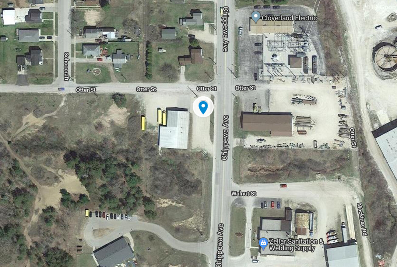 Manistique bus garage parking lot on the corner of Otter Street & Chippewa Avenue.